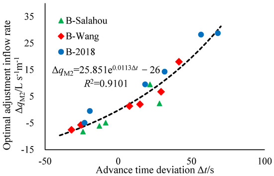 All Δt and corresponding ΔqM1 were counted and fit with a function, leading to the empirical model of the first inflow adjustment strategy (see Figure 3). ΔqM1 and Δt of B-Salahou, B-2018, and B-Wang all follow an exponential function, Equation (8). The decision coefficient was R2 = 0.9397, which means that, based on this formula, the first optimal adjustment inflow rate was accurately obtained.