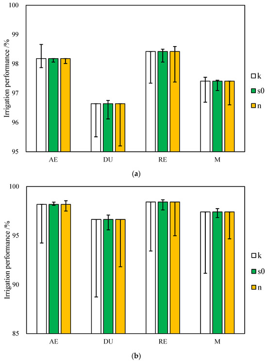 Irrigation performance of the proposed system when the natural parameters are varied by (a) ±10% and (b) ±20%. The columns indicate the irrigation performance without the natural parameter variation, and the vertical bars indicate the standard deviations of the irrigation performance under the natural parameter variation.