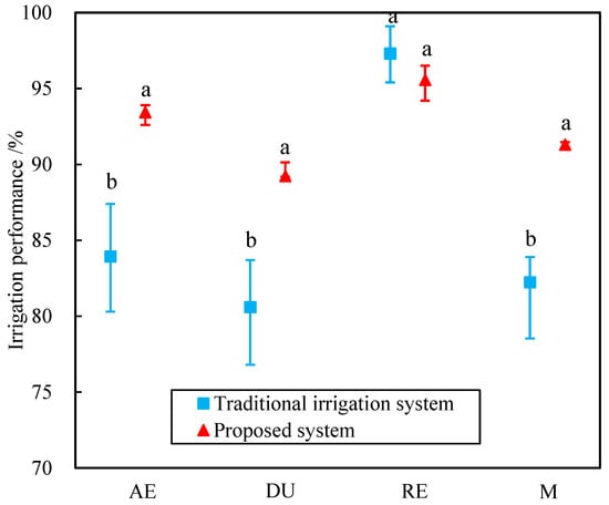 Irrigation performance of the proposed system compared with that of the traditional constant-discharge border irrigation system. The vertical bars labeled with “a” and “b” for each irrigation-performance indicator indicate significant differences at p = 0.05, based on the independent sample t-test.