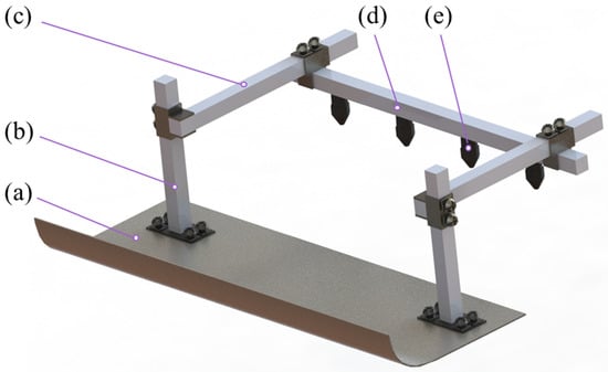 Positional relationship between the canopy opener and nozzle. (a) The canopy opener; (b) adjusting the height between the canopy opener and spray boom; (c) adjusting the horizontal distance between the canopy opener and spray boom; (d) spray boom; (e) nozzle.