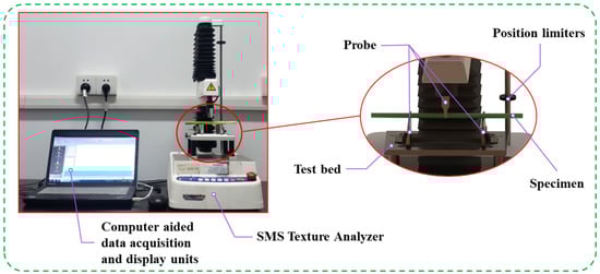 The parameters of 100 rice plants were measured, including plant height, leaf number, leaf area, leaf width, stem length, stem diameter, and stem wall thickness. To simplify the rice structure, the stem and leaves were mainly considered. A digital scale with an accuracy of 0.01 g was used to weigh the rice, and the average volume of the rice was determined using the water displacement method [25]. Then, the average density of the rice was calculated (Table 1). The elastic modulus of the stems of 100 rice plants was determined using a three-point bending test (Figure 3) with an SMS texture analyzer [26] (TA.XT Express Connect, Texture Technologies Company, Hamilton, MA, USA).