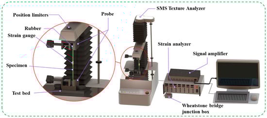 Measuring Poisson’s ratio of rice stems using tensile test and electrical measurement method. Tensile tests were conducted on the rice stem samples using an SMS texture analyzer. Use electrical measurement method to measure the transverse strain of rice straw and further calculate Poisson’s ratio [27]. For the experiment, 100 straight rice stem samples were selected, and the ends of the stems were polished smooth with sandpaper. The rice samples were wrapped in soft elastic rubber. The rice stem samples were wrapped with soft elastic rubber at both ends to reduce damage to the samples caused by the fixture (Figure 4). Used strain glue to attach the strain gauge to the measuring point in the middle of the rice stem samples. The strain gauge parameters used in this experiment are listed in Table 2. To ensure the freshness of the rice, all testing was completed within 24 h.