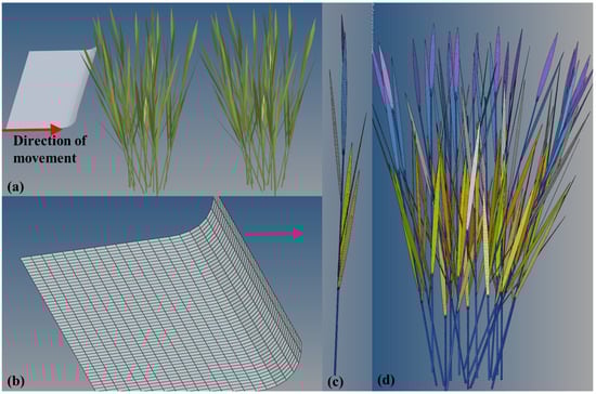 Figure 11 illustrates the process of the canopy opener leaving the rice cluster after opening the rice canopy layer. Before the canopy opener contacts the rice cluster, no gap exists between the two clusters of rice (Figure 11a). As the canopy opener begins to contact the rice, the rice stems bend forward in the direction of the canopy opener (Figure 11b). When the canopy opener completely leaves the first cluster of rice, the rice stems rebound and oscillate in the direction opposite to the movement of the canopy opener (Figure 11d).