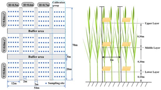 Water-sensitive paper (WSP, 25 × 75 mm2) was used as the sampling material to capture liquid droplets. The sampling points were placed as shown in Figure 9, with each point sampled three times. Samples were collected after the droplets had completely dried. The WSP was carefully removed using clean tweezers, and it was marked and analyzed with DepositScan V1.2 image processing software [30]. In the field experiment, 720 sediment measurements were conducted, consisting of 12 experiments, 20 collection points, and 3 different collection points. The WSP model number was 20301-1N. A Lenovo M7605D scanner (Lenovo, Beijing, China) was used to scan the water-sensitive paper at 600 dpi.