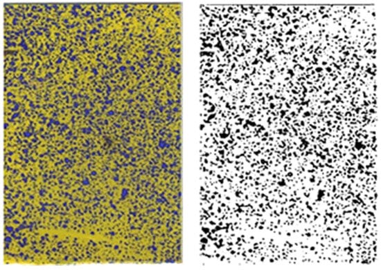 where represents the droplet deposition rate; and denote the number of pixels in the width and height of the analyzed area, respectively; and represents the value of the pixel at the relative coordinates of in the binary images of the analyzed area. If the pixel was black, then = 1; otherwise, = 0. Figure 10 shows the original image and conversion results of the WSP.