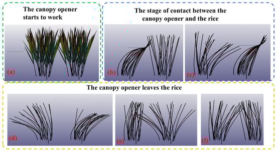The process of the action of the canopy opener on the rice canopy. (a) The canopy opener starts to work, (b–d) contact between the canopy opener and rice, and (e,f) canopy opener leaves the rice.