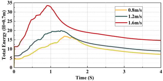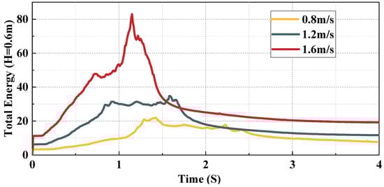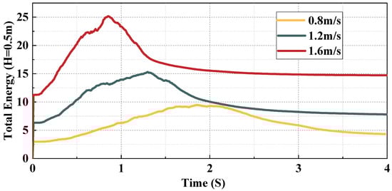 Change in modeled total energy over time under different driving velocities (H = 0.6 m).