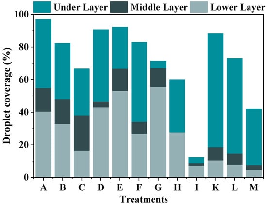 Droplet deposition rate of each layer of rice under different treatments. A~M correspond to the treatments in Table 5.