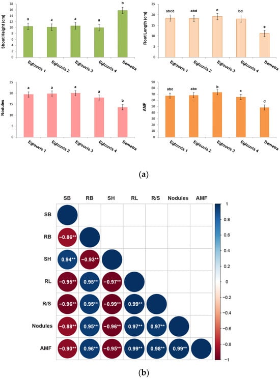 Lentil plant morphological properties: shoot height (SH), shoot biomass (SB), root biomass (RB), root length (RL); root shoot ratio (R/S); nodules, arbuscular mycorrhizal fungi (AMF). (a) Barplots of shoot height, root length, nodules, and AMF. Values that share no common letter are significantly different according to Tukey’s HSD (p < 0.05). (b) Pearson’s correlation plot of the morphological measurements for segregated Eglouvis and Demetra plants (** p < 0.01).