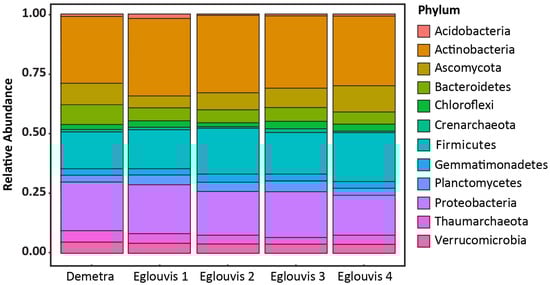 Out of 288,462 sequence reads (approx. 58,000 reads per sample), 836 different operational taxonomic units (OTUs) were identified excluding singletons. Because of ITS’ high sensitivity, several eukaryotic organisms such as plants, nematodes, and mammals were also identified. Therefore, the following phyla were excluded from the analysis: Arthropoda, Nematoda, Streptophyta, and Chordata. From the remaining OTUs (803), upon applying 97% cut-off, we used 733 OTUs from the most abundant phyla for further statistical analysis. The overall microbiome consisted of 87% bacteria, 9% eukaryota including fungi, and 4% archaea. The most abundant bacterial phyla were Actinobacteria (30%), followed by Proteobacteria (19%) and Firmicutes (18%) (Figure 2). Archaeal phyla consisted of Crenarchaeota and Thaumarchaeota, which were identified with 4502 total reads. For all samples, rarefaction curves reached a plateau after approximately 15,000 reads, indicating sufficient sequencing depth (Figure S1) for further diversity analysis of the obtained datasets. Eglouvis 3 displayed the most abundance, while Demetra, which was used as control, displayed the least. Eglouvis 1 and Eglouvis 2 displayed almost the same abundance, with almost 300 species.
