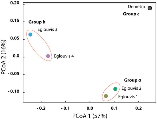 We observed diverse microbiomes associated with the rhizospheres of Eglouvis samples and Demetra. Among all targeted rhizosphere microbiomes, Eglouvis 3 had the greatest α diversity: 467, 4.590, and 0.979 for Chao1, Shannon, and Simpson indices, respectively (Figure 3). Eglouvis samples had, on average, greater α diversity indices than the control Demetra (Figure 3). Chi-square test analysis was conducted to assess the independence of samples, indicating that significant differences exist among relative abundances of samples at a significance level of p = 0.05. Further α diversity indices are reported in Table S2. Differences in β diversity at phylum level (Bray-Curtis) were illustrated with PCoA analysis (Figure 4). The first two PCoA axes explained approximately 73% of the total variation within the rhizosphere microbiome. Eglouvis samples (1–4) were ordinated distant to Demetra and clustering analysis separated the microbiome dataset into three groups: group a consisted of Eglouvis 3 and 4, group b of Eglouvis 1 and 2, and group c of Demetra. Furthermore, we assessed whether differences in β diversity were associated with plot distance (sampling distance) and typical physiological plant traits, including shoot and root biomass, root length, thousand seed weight, arbuscular mycorrhiza fungal colonization, and rhizobia nodules abundance, using Μantel correlation and redundancy analyses, respectively. Plot distance explained approximately 35% of the variation in rhizosphere diversity; thus this correlation was not significant (Mantel r = 0.345, p = 0.17), whereas the correlation between explanatory variables (plants traits) and response variables (rhizosphere microbiome) was strong (Mantel r = 0.81), and this association was marginally significant (p = 0.09).