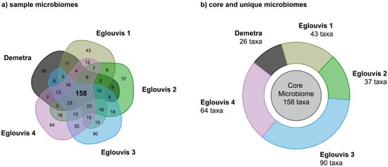 Unique bacterial and fungal taxa were identified in higher numbers in landrace samples compared to the modern cultivar. Specifically, the unique bacterial taxa present in the Eglouvis 1–4 rhizosphere microbiome samples ranged within 38–88, with the Eglouvis 3 sample exhibiting 88 bacterial taxa, in comparison to Demetra presenting 25 (Table 3). On the other hand, far fewer fungal taxa were identified as unique in all samples, with a range of 0–2. Thus, the total number of unique taxa identified in all samples ranged within 37–90, with the Eglouvis 3 sample hosting the largest number (90) of unique taxa and Demetra the smallest (26).