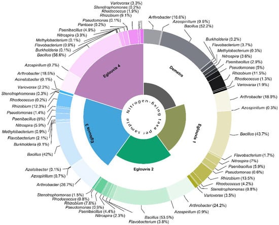 Subsequently, the partitioning of major free-living N2-fixing bacterial taxa was assessed among samples at the genus level. The percentage of each N2-fixing bacterial genus detected in the rhizosphere microbiome of each sample is depicted in Figure 6. Interestingly beyond the Rhizobium and Bacillus genera present in high amounts, a number of other key nitrogen fixers were also identified, with most of them present in the landrace samples. More specifically, the commercial variety had less nitrogen-fixing taxa (942) than Eglouvis 1–4 (1433–3890), comprising nearly 8 to 15% of the sequenced taxa. A roughly two-fold greater abundance of Nitrospira, Paenibacillus, Rhodococcus, and Variovarax spp. was found in rhizosphere samples of Eglouvis 1 relative to Demetra. The abundance of Azospirillum, Flavobacterium, and Pseudomonas spp. was approximately two-fold less in Eglouvis 1 compared to that in Demetra rhizosphere samples. For Eglouvis 2, Arthrobacter, Paenibacillus, and Stenotrophomonas spp. were 50% more abundant than in Demetra. A 50% reduction was observed for taxa belonging to the genera of Nitrospira, Pseudomonas, Rhizobium, and Rhodococcus spp. when compared to Demetra rhizosphere samples. For Eglouvis 3, the abundance of Arthrobacter, Methylobacterium, Nitrospira, Paenibacillus, and Stenotrophomonas spp. was greater than 50% when compared to Demetra. Interestingly, Azotobacter spp. were identified only in the Eglouvis 3 sample. Lastly, in the rhizosphere sample of Eglouvis 4, greater abundance (≤50%) was observed for Paenibacillus, Rhodococcus, and Variovorax spp., and there was a noticeable reduction in Azospirillum, Burkholderia, Flavobacterium, and Methylobacterium spp. compared to in Demetra. The abundance of Bacillus spp. remained unchanged through all samples and comprised about 50% of the nitrogen-fixing taxa.