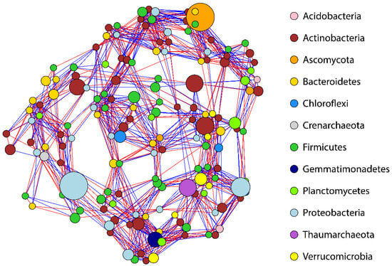The co-occurrence network of the lentil rhizosphere microbiome. Core microbiome co-occurrence network at the phylum level. Red links indicate negative and blue links indicate positive correlation. Node size indicates the average relative abundance of microbial species.