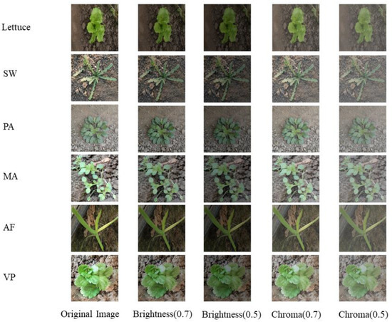 Lettuce and weed images were collected in Weifang, Shandong, China (36.755, 119.211; Sunny Day), forming the original dataset, which includes 275 images. This dataset encompasses images of five distinct weed species: 52 Veronica polita Fries (VP) weeds, 51 Avena fatua L. (AF) weeds, 54 Malachium aquaticum L. (MA) weeds, 87 Plantago asiatica L. (PA) weeds, and 23 Sonchus wightianus DC. (SW) weeds, as is visually represented in Figure 1. To meet the data requirements for machine learning model training, data augmentation techniques were employed. Besides using flip and rotate, the original images of both weeds and lettuce underwent enhancement, involving chroma adjustment and brightness adjustment. Through comparison, it was found that when the brightness and chroma are adjusted to between 0.5 and 0.7 of the original images, there can be obvious differences between the original images after adjustment, and too many shadows and highlights will not be generated in the image process; that is, the original image is randomly selected [26]. Adjusting the chroma and brightness of the image from 0.5 to 0.7 for data enhancement can show the difference from the original image while still retaining the details of the original image. In the case of lettuce plants, 100 images were randomly chosen for data augmentation, while the remaining 175 lettuce images were designated as the test set. Following data augmentation, the new dataset included 312 VP images, 306 AF images, 324 MA images, 408 PA images, 138 SW images, and 430 lettuce images. For model training, 116 plant images were allocated to the training set, with 372 images for testing purposes. The effect of the data enhancement is shown in Figure 2.