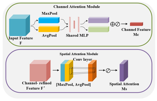 The convolutional block attention module (CBAM) [33] represents a potent attention mechanism, offering a lightweight solution compatible with various prominent CNN architectures. CBAM is trainable in an end-to-end fashion and exhibits a two-fold inference process on feature maps: it sequentially derives attention maps along two distinct dimensions; namely, channel and spatial. These derived attention maps are then employed to dynamically refine the input feature map through element-wise multiplication.