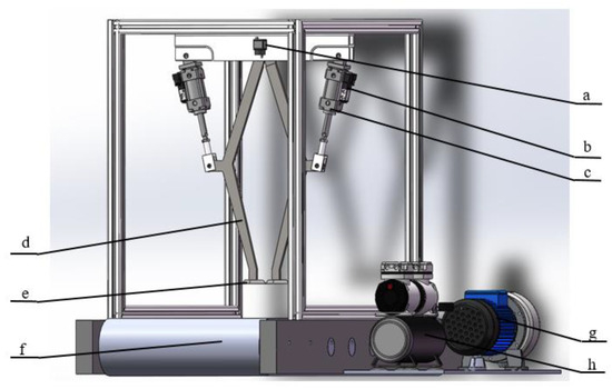 Open-closed intra-row weed control device: (a) industrial camera; (b) solenoid valve; (c) pneumatic cylinder; (d) mechanical arm; (e) weed cutting blade; (f) conveyor belt; (g) air compressor/pneumatic pump; (h) electric motor.