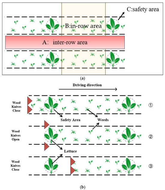 Figure 8 illustrates the working process of the intra-row weeding device. In the crop field, three areas are artificially distinguished: area A is the inter-row area, area B is the intra-row area, and area C is the crop safety area. Within the crop row, the weeding knife blade (about 7 cm wide) was used to control intra-row weeds. Figure 8b shows the sequence of the three positions in which the weeding knife blade is moved from left to right. In position ① and position ③, the weeding blade is positioned in the “closed” position in the intra-row area driven by the cylinder, and the two blades advance in parallel. As the blade approaches the lettuce plant, in position ②, the cylinder separates the blade into the inter-row area along the purple dotted line. This leaves the safety zone C unbroken. After the knife blade has passed the lettuce, the cylinder re-drives the blade back into the intra-row area. This process is repeated for each lettuce crop. When not in the crop area, the weeding knife is in a closed state and penetrates deep into the soil. As the machine (conveyor belt) travels, all weeds in the area are removed by their roots.