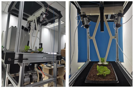 In the conveyor belt experiment, we mainly verified the weeding effect of the weeding system under different weed densities and different light conditions. The control of lighting conditions is mainly controlled by LED light strips, and different densities of weeds are planted between the lettuce to simulate different densities of weeds. The light strips that are turned on are considered to represent good lighting conditions. The positioning of weed density is based on the research of Rekha Raja et al. [36]; that is, light weed density is defined as 10 or fewer weeds per square meter; moderate weed density is 11–100 weeds per square meter; and heavy weed density is defined as more than 100 weeds per square meter. Figure 10 shows the experimental equipment and real experimental scenes.