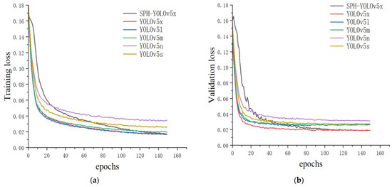 The optimized YOLOv5 model was compared with five other YOLOv5 model sizes. The variation values during the training of the six models was shown in Figure 11 and Table 1. Figure 11a shows the training loss curve with the training period in weed–lettuce identification. All models decreased rapidly within 40 cycles and eventually stabilized as the training period increased. Among the six models trained, the proposed SPH-YOLOv5x model obtained the lowest loss values. Figure 11b shows the loss curves of the six models in the validation phase. Although the proposed SPH-YOLOv5x model fits slightly slower than the other models until at least 20 rounds, as with the training loss curves, the SPH model eventually obtains the lowest validation loss value. The proposed SPH-YOLOv5x model achieved the lowest loss values on both the training and validation sets, demonstrating its strong learning capabilities and generalization ability in weed classification.