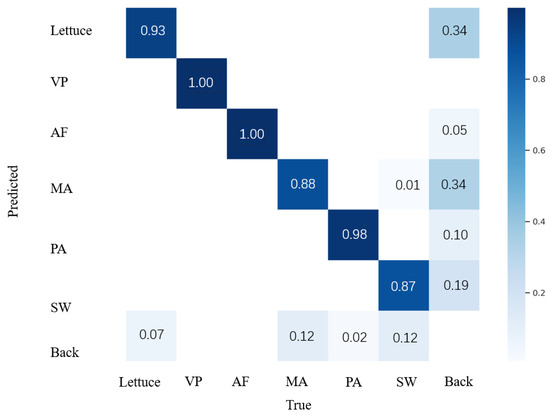 As shown in Table 3, the classification performance of the SPH-YOLOv5x model was analyzed for lettuce crops with five weeds: Veronica polita Fries, Avena fatua L., Malachium aquaticum L., Plantago asiatica L., and Sonchus wightianus DC. (VP, AF, MA, PA, SW). The accuracy of the model in correctly identifying lettuce was 92.9% for the identification of weeds. The model had the highest classification accuracy of 98.7% for PA and the lowest recognition ability of 89% for SW. Even so, the model’s ability to classify lettuce and weeds is still at a high level. By observing the confusion matrix shown in Figure 12, it is evident that the proposed model achieves good identification and classification results for both lettuce and various weeds.