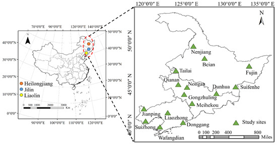 The three northeastern provinces (Heilongjiang, Jilin, and Liaoning) are among the top three black soils in the world. This region is mainly located in the Songliao Plain, the Three Rivers Plain, the pre-mountainous terraces, and the inter-mountainous basins and valleys. The study area is dominated by a temperate continental monsoon climate. Although the latitude is high, most of the area belongs to the temperate monsoon climate zone, with rain and heat at the same time. The region is an important production base for potatoes and one of the most significant potato export destinations in China. In this paper, 15 meteorological observation stations uniformly distributed in potato growing areas in Heilongjiang province (Nenjiang—NJ, Beian—BA, Fujin—FJ, Tailai—TL, Suifenhe—SFH), Jilin province (Qian’an—QA, Nong’an-NA, Dunhua—DH, Meihekou—MHK, Gongzhuling—GZL), and Liaoning province (Donggang—DG, Jianping—JP, Liaozhong—LZ, Suizhong—SZ, and Wafangdian—WFD) were selected as typical stations. The distribution of the stations is shown in Figure 1.