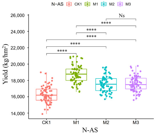 Differences in potato yields under different nitrogen application styles (**** represents a significant difference at 0.001 level, and Ns represents no significant difference).