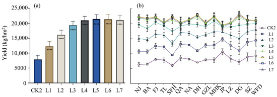 Variation in potato yield at different N-AL: (a) differences in overall potato yield at different N-AL (**** represents a significant difference at 0.001 level); (b) differences in potato yield at different stations.