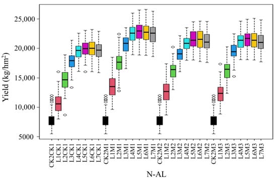 Box plot of changes in potato yield under different N-AS and N-AL interactions.