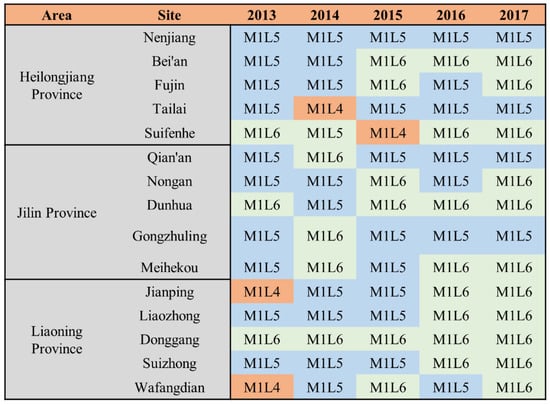 As shown in Figure 5, in 2013–2017, the N application treatments corresponding to the highest net gains of potatoes among the sites in the three northeastern provinces differed slightly. Among all the treatments corresponding to the highest net gains within the sites in Heilongjiang province, the M1L4 treatment accounted for the largest share, with a weighting of 76%, the M1L5 treatment accounted for 20%, and the M1L6 treatment accounted for 4%. The largest share of all treatments corresponding to the highest gains within each site in Jilin province was also the M1L4 treatment, with a weight of 68%, and the M1L5 treatment, with a weight of 32%. The largest share of all treatments corresponding to the highest gain within each site in Liaoning province was the M1L5 treatment with a weight of 60%, M1L4 with a weight of 28%, M1L3 with a weight of 8%, and M1L6 with a weight of 4%. The study found that the best field management program for potato cultivation produced the highest gains. Treatments M1L4, M1L4, and M1L5 were the best field fertilization management programs for potato cultivation in Heilongjiang, Jilin, and Liaoning provinces, respectively.