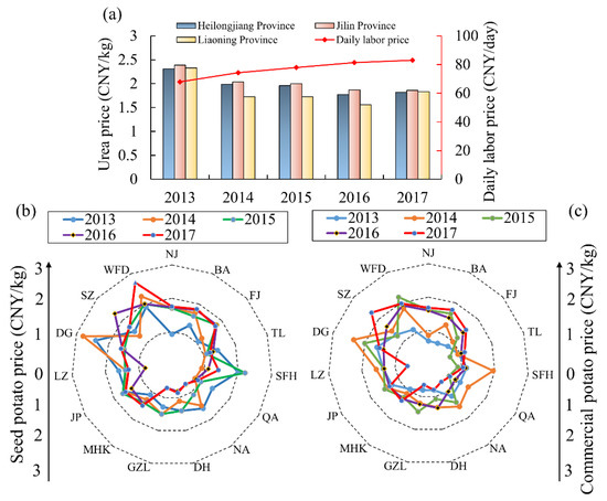 Main cost prices of potatoes in northeast China, 2013–2017: (a) daily laborer price and urea price; (b) seed potato price; (c) commercial potato price.