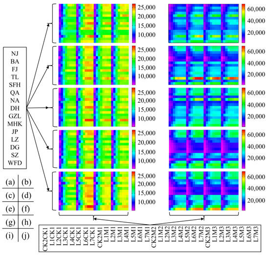 In the northeastern region of China, experiments were conducted from 2013 to 2017 on potatoes under various N-AS and N-AL interaction treatments. Thirty-two different modes of N application treatments were applied to each station. The net potato gains under all the N application treatments in the experiments at each station were calculated by combining the cost of potato production in each region (as shown in Figure 6). Figure 7 displays the yield of potatoes and the corresponding economic benefits for each location across various years. Potato yield is displayed in the left column of the heat map in Figure 7, while the corresponding economic gains are displayed in the right column. A variety of values are represented by different hues, where bigger values are indicated by colors closer to red and smaller values are indicated by colors closer to purple.