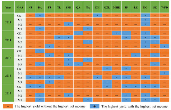 In the northeast, a total of 15 meteorological stations were chosen for N fertilizer trials, with four distinct N application methods tested at each location. There were a total of 20 treatments on N application styles at each location across the five-year experiment period. In the northeast, there were 300 experimental cases in all, and there were eight N application levels for every N application style. In the spatial arrangement of the 300 experimental instances, it was discovered that 79% of the cases did not receive the maximum profits when the highest yield was attained. This information is based on data on the relationship between the highest potato yield and the highest net gains in different cases (Figure 8). Heilongjiang, Jilin, and Liaoning provinces accounted for 78%, 87%, and 71%, respectively. This phenomenon suggests that the failure to obtain the highest net gains at the time of the highest potato yield is not a fortuitous event and that the scenario with the highest percentage of N application treatments corresponding to the highest net gains among all sites in each province can be considered as a reference for the future development or adjustment of potato field planting management decisions in that province.