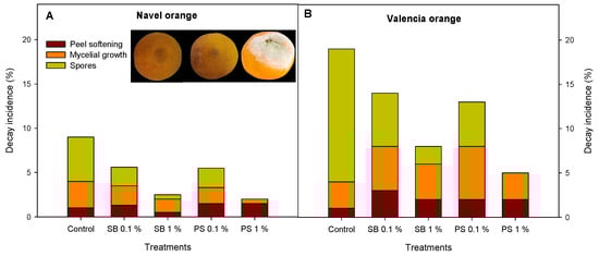 Effect of preharvest treatments with sodium bicarbonate (SB) and potassium silicate (PS) at 0.1 and 1% in the fungal decay incidence and the fungal development (peel softening, mycelial growth, spore production) in Navel (A) and Valencia (B) oranges after 42 days of storage at 8 °C.