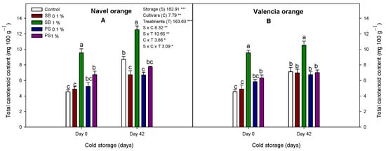 Total carotenoid content significantly increased (p < 0.05) during the storage period, around 20%, on average, in each treatment and in both oranges (Figure 2). Navel oranges treated with SB 1% and PS 0.1 and 1% showed the highest quantity of TCC at harvest, with an increase of 110%, 15%, and 45%, respectively, compared to the control ones (4.54 ± 0.26 mg 100 g−1) (Figure 2A). A similar effect was observed in Valencia oranges (Figure 2B). These differences observed at harvest were maintained after 42 days of cold storage in Navel oranges but not in Valencia oranges. The TCC in oranges treated with BS 0.1% and PS 0.1 and 1% did not show any significant (p < 0.05) differences from the control oranges.