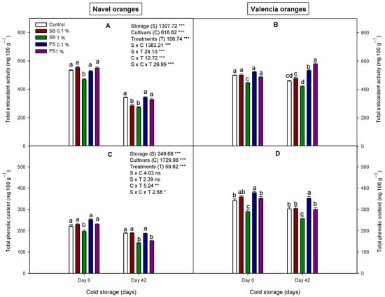 The bioactive content of oranges was evaluated in both orange cultivars at harvest and after 42 days of storage (Figure 3). In Navel oranges, the TAA decreased significantly (p < 0.01) during cold storage. At harvest, Navel oranges treated with SB 1% showed the lowest TAA, 12% lower than the control ones (Figure 3A). Furthermore, oranges treated with SB 0.1% and PS 0.1 and 1% showed a TAA similar to the controls, without any significant (p < 0.05) differences among those treatments. After 42 days of cold storage, Navel oranges treated with SB 0.1 and 1% showed a decrease in the TAA of 17% and 20%, respectively, compared to control ones. Navel oranges treated with PS 0.1 and 1% maintained a TAA similar to the control (Figure 3A). The TAA in Valencia oranges showed a slight decrease during cold storage, and some of the treatments increased the TAA (Figure 3B). However, the effect of the treatments was similar to those previously described in Navel oranges. Oranges treated with SB 1% showed a 10% decrease in the TAA, on average, at harvest and after 42 of cold storage compared to the control ones. On the contrary, Valencia oranges treated with SB 0.1% and PS 0.1 and 1% showed a TAA similar to controls at harvest. Oranges treated with PS 0.1 and 1% showed an increase in the TAA of 17% and 27%, respectively, after 42 days of cold storage (Figure 3B). Total phenolic content is an important part of the TAA in oranges. TPC decreased in Navel and Valencia oranges by 15% and 10%, on average, respectively, during the storage period (Figure 3C,D). Navel oranges treated with SB 1% showed a 10% decrease compared to the control ones at harvest. Furthermore, Navel oranges treated with SB 0.1% and PS 0.1 and 1% did not show any significant differences (p < 0.05) in the TPC compared to the control. After 42 days of cold storage, Navel oranges treated with SB 1% and PS 1% showed a decrease of 25% and 19%, respectively. However, Navel oranges treated with SB and PS 0.1% maintained their TPC similar to the control ones, without any significant differences among those treatments (Figure 3C). The TPC of Valencia oranges treated with BS 1% decreased by 15%, on average, at harvest and after 42 days of cold storage compared to the control ones. Furthermore, Valencia oranges treated with PS 0.1% showed an increase in their TPC of 11% and 16%, respectively, at harvest and after cold storage. Valencia oranges treated with BS 0.1%, PS 1%, and controls did not show any significant differences (p < 0.05) (Figure 3D).