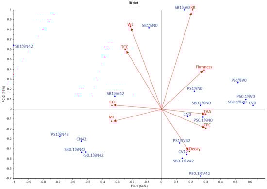 Principal component analysis (PCA) was applied to all data to determine the effect of the preharvest treatments with SB and PS at 0.1 and 1%, the importance of the cultivar, and the storage period. The variance of the first (PC-1) and the second (PC-2) principal components was 65% and 18%, respectively, and the accumulative variance contribution was 83%. PC-1 is clearly identified with MI, CCI, TAA, and TPC, while PC-2 is related to WL, RR, and decay. The factor contributing the most to the positive side of PC-1 was TAA and TPC, while CCI and MI contributed to the negative side. Regarding PC-2, on the positive side, WL and RR were the most relevant parameters, and on the negative side, decay was the most important. Thus, PC-2 allowed the discrimination of the preharvest treatments applied, showing that controls, SB 0.1% and PS 0.1 and 1%, were closer than SB 1% (Figure 4), independent of the storage time and cultivar. Finally, storage time and cultivar were more dependent in PC-1.