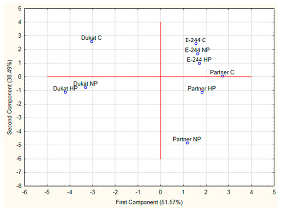 Moreover, the biplot of the principal component analysis (PCA) (Figure 2) illustrated the relationship between priming treatments and field pea cultivars. Priming treatments were clearly separated from the control, except nanopriming in cv. E-244, due to its lower effects on the examined pea parameters. Besides, PCA showed that pea cultivars were separated from each other within the same group. Thus, the results indicated that the comprehensive nanopriming treatment had the greatest effect on cv. Partner, followed by hydropriming treatment, while hydropriming and nanopriming treatment effects were more alike/uniform in cv. E-244 and cv. Dukat. The obtained results clearly emphasized the role of seed nanopriming treatment in improving seed germination and enhancing the initial growth of field pea plants. However, the different response of pea cultivars to nanopriming treatment implies the possibility of improving seed germination and pea seedling growth by adjusting the appropriate nanopriming seed treatment, which includes the concentration of the priming solution and the duration of priming treatment, to the requirements of each cultivar in the laboratory and in the field.