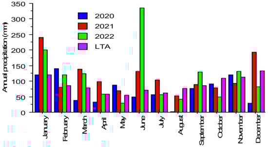 Average monthly total precipitation for autumn of 2020, 2021, 2022, and long-term average (LTA).