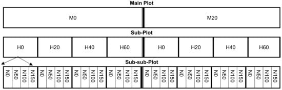 The distribution of manure, humic acid, and nitrogen doses in the main plots, sub-plots, and sub-sub-plots according to a randomized complete block design with a split–split plot arrangement (the figure shows treatment combinations, not field applications. The factors were distributed considering randomized procedure).