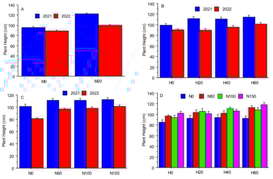 Plant height as affected by year, manure, humic acid, and nitrogen. (A) = Y × M, (B) = Y × H, (C) = Y × N, and (D) = H × N interactions. Bars indicate ±1 s.e.