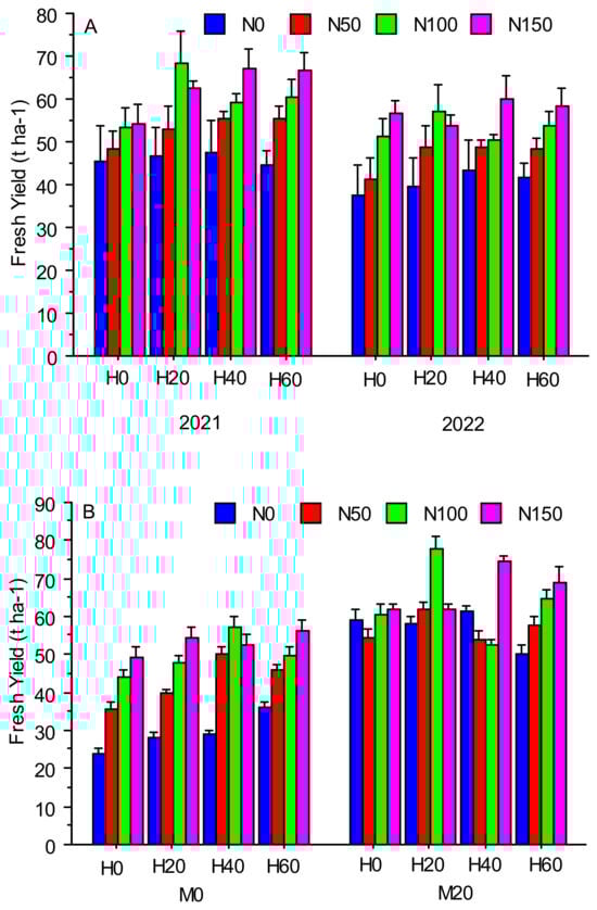 Fresh forage yield as affected by year, manure, humic acid, and nitrogen. (A) = Y × H × N, (B) = M × H × N. Bars indicate ±1 s.e.