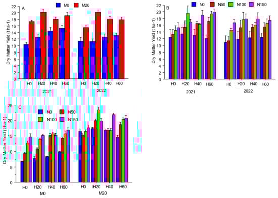 Dry matter yield as affected by year, manure, humic acid, and nitrogen. (A) = Y × H × M, (B) = Y × H × N, (C) = M × H × N. Bars indicate ±1 s.e.