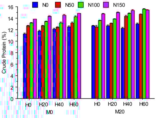 Manure, humic acid, and nitrogen applications, as well as Y × M, M × H, H × H, H × N two-way interactions, and the M × H × N interaction, significantly affected the crude protein ratio. An increase in humic acid and nitrogen doses resulted in an increased crude protein ratio compared to untreated plots (Table 2). However, when manure was applied, the increase in nitrogen and protein was not statistically significant in H40 and H60 treatments (Figure 6).