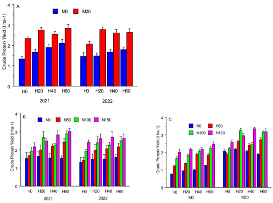 Crude protein yield as affected by year, manure, humic acid, and nitrogen (A) = Y × H × M, (B) = Y × H × N, (C) = M × H × N. Bars indicate ±1 s.e.