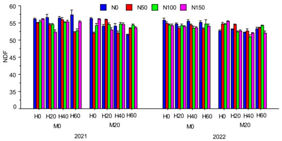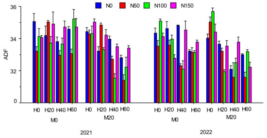 All the main effects and interactions, with the exception of the Y × M, Y × M × H interactions, affected the NDF ratio. Similarly, the treatments and their combinations, except for the Y × M and Y × N two-way interactions, as well as the M × H × N three-way interactions, had statistically significant effects on the ADF ratio. Similarly, in both 2021 and 2022, the NDF and ADF values exhibited wide variations among treatments and between years. In 2021, the ADF and NDF ratios were higher in untreated plots in some treatments, whereas, in 2022, they were higher in treated plots (Figure 8 and Figure 9).