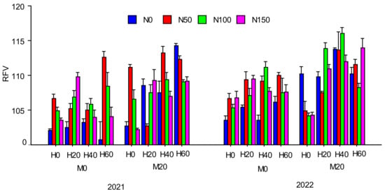 The relative feed value (RFV) was statistically significant, except for the year, manure, humic acid, nitrogen, and the second- and third-order interactions, Y × M and Y × M × N. When manure was applied, the highest feed quality was obtained from the H40, H60, N50, and N100 treatments (see Table 2). In 2021 and 2022, the RFV values among the treatments exhibited instability concerning the years and treatments and displayed wide variation.