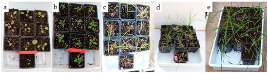 Species tested before applying the treatments: (a) Sonchus oleraceus, (b) Chenopodium album, (c) Lolium rigidum (BBCH 12–13), (d) Lolium rigidum (BBCH 14–15), (e) Triticum aestivum.