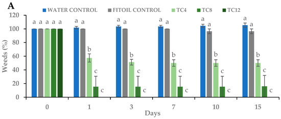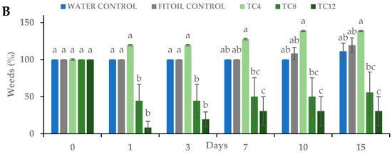 T. capitata EO showed greater herbicidal activity with increasing concentrations (Figure 3) and it was more effective against dicotyledonous (Figure 3A) than monocotyledonous (Figure 3B) weeds. The lowest concentration tested of the EO did not control the growth of monocotyledonous species (Figure 3B). The dicotyledonous species developed were P. oleracea, A. sericifera, A. retroflexus, A. blitoides and S. oleraceus. Treatment TC4 reduced 45% of the dicotyledonous weeds present in the trays at the end of the trial, while TC8 controlled 84% of the developed dicotyledonous weeds and TC12 controlled 100% of the dicotyledonous weeds from day 1 after treatment application until the end of the assay. Previous studies have demonstrated the efficacy of T. capitata EO to control spontaneous dicotyledonous weeds from the soil seedbank (A. blitoides, Amaranthus albus, E. bonariensis and Euphorbia prostata) with an efficacy of 63.1% and 82.4%, respectively, when applied at a concentration of 4 µL·mL−1 (the same of TC4) with a volume of 1.83 L/m2 and 2.775 L/m2 [27]. Previous studies with T. capitata EO tested against targeted plants had shown 100% of efficacy on A. retroflexus when applied at concentrations of 8 and 12 µL·mL−1 (same as TC8 and TC12) and 90% of efficacy on P. oleracea at 12 µL·mL−1 (TC12) [29].
