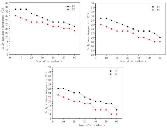 Daily mean temperature, daily high temperature, and daily low temperature were measured for ET and NT conditions during grain filling.